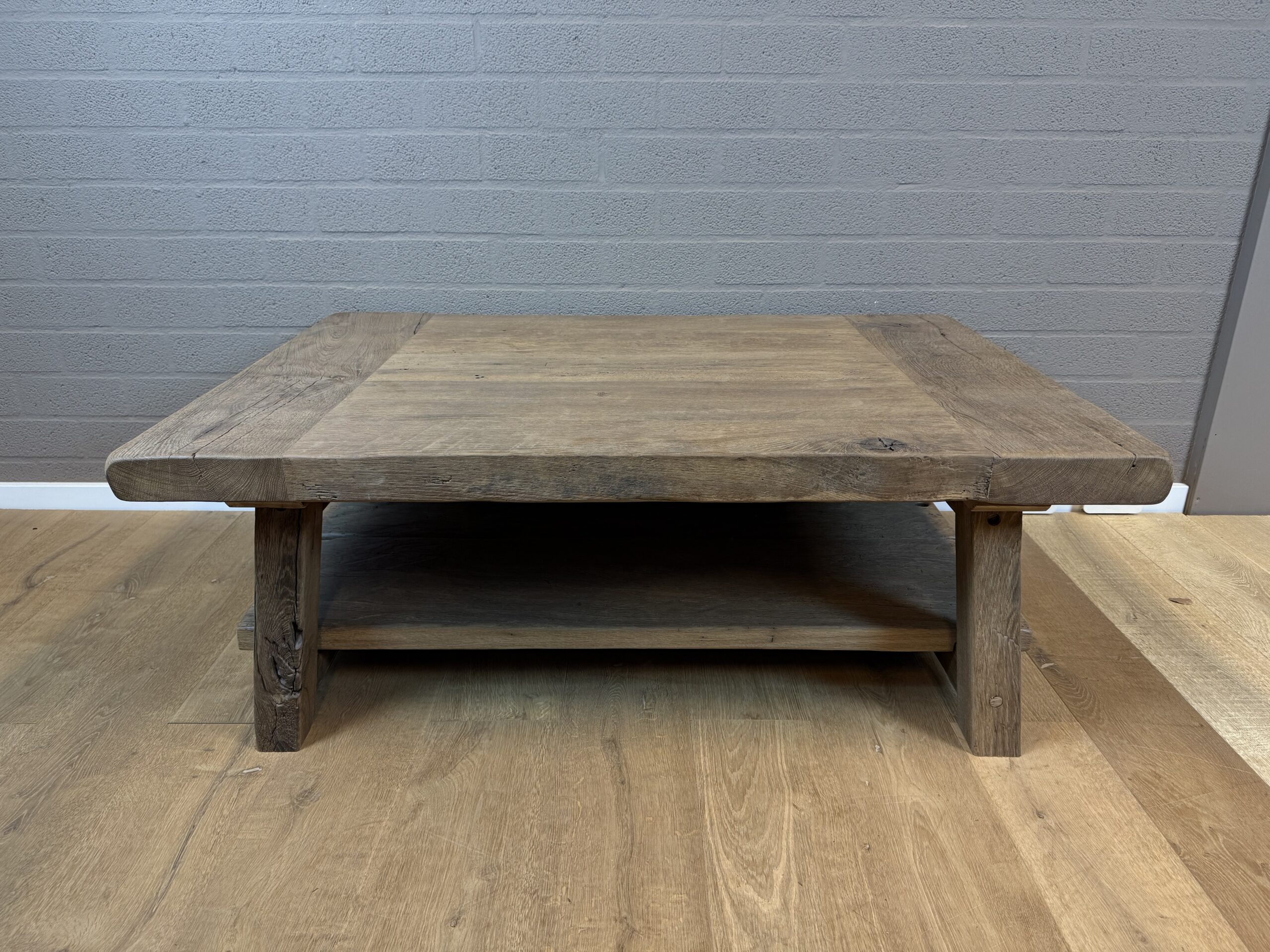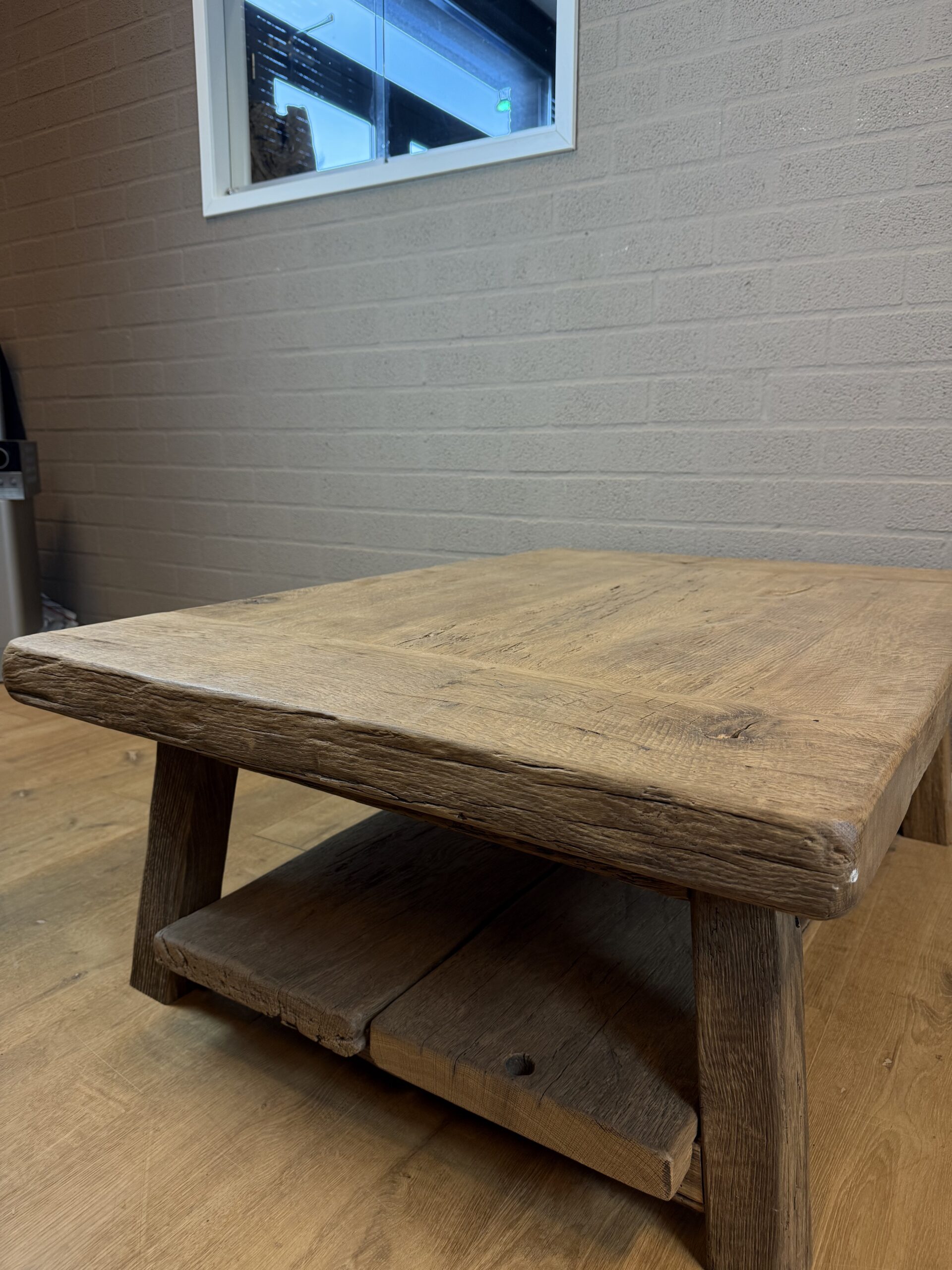 Een stoere salontafel met houten A-poot onderstel en een blad van gerecycled massief oud eikenhout – met de hand gemaakt, stevig en stijlvol.